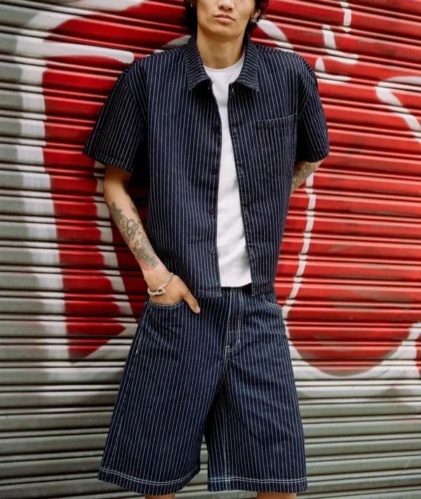 Introducing Our Short Sleeve Shirt in Blue With White Pinstripes. The shirt features one chest pocket with our signature logo embroidered into the upper left side. Cut to a refined boxy, slightly cropped fit making our short sleeve an outerwear essential.